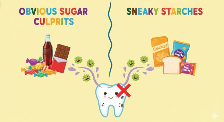 Crackers, chips, bread, and even those “healthy” fruit snacks can be just as sneaky. These starches break down into sugars that feed cavity-causing bacteria. The real troublemaker isn’t just what your kid eats, it’s how often they eat.